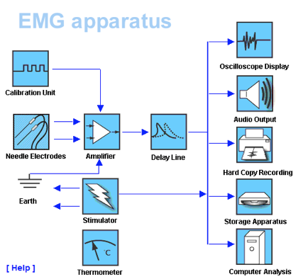 In its simplest form the EMG/NCS recording apparatus consists of one or more amplification systems, a display unit, a sound amplifier with loud speaker, a permanent storage system, stimulator and calibration unit. An instrument for measuring the skin temperature is also important. Machines these days will also include an ‘averager’, computer analysis as well as provision for a delay line.